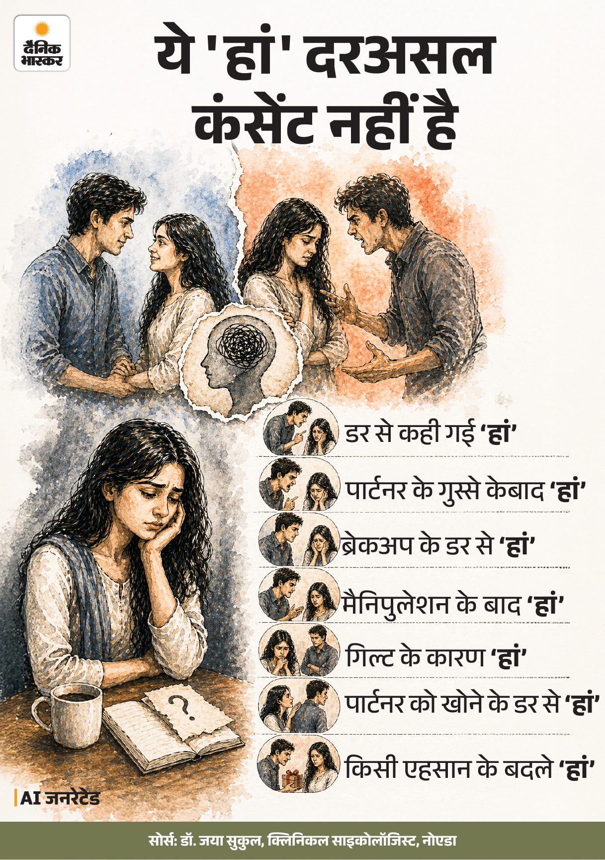 रिश्ते में किसी की बात मान लेना और मन से राजी होना, दोनों में बड़ा फर्क है। फीमेल पार्टनर झगड़ा टालने या सामने वाले की खुशी के लिए ‘हां’ कह देती हैं, लेकिन असल में तैयार नहीं होतीं। ऐसी मजबूरी में दी गई सहमति धीरे-धीरे रिश्ते में कड़वाहट घोल सकती है। ग्राफिक से समझिए कि किस ‘हां’ का मतलब कंसेंट नहीं है-
