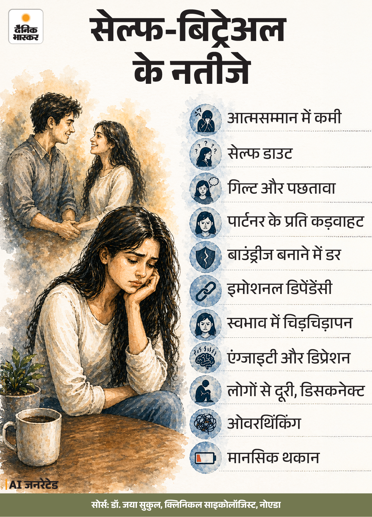 अगर आप अपने मन और मूल्यों के खिलाफ जाकर पार्टनर की खुशी के लिए समझौता करती हैं तो यह ‘सेल्फ-बिट्रेयल’ (स्वयं को धोखा देना) है। इसका आपके व्यक्तित्व पर गहरा असर पड़ता है। इससे कई तरह के नुकसान हो सकते हैं। ग्राफिक में देखिए-
