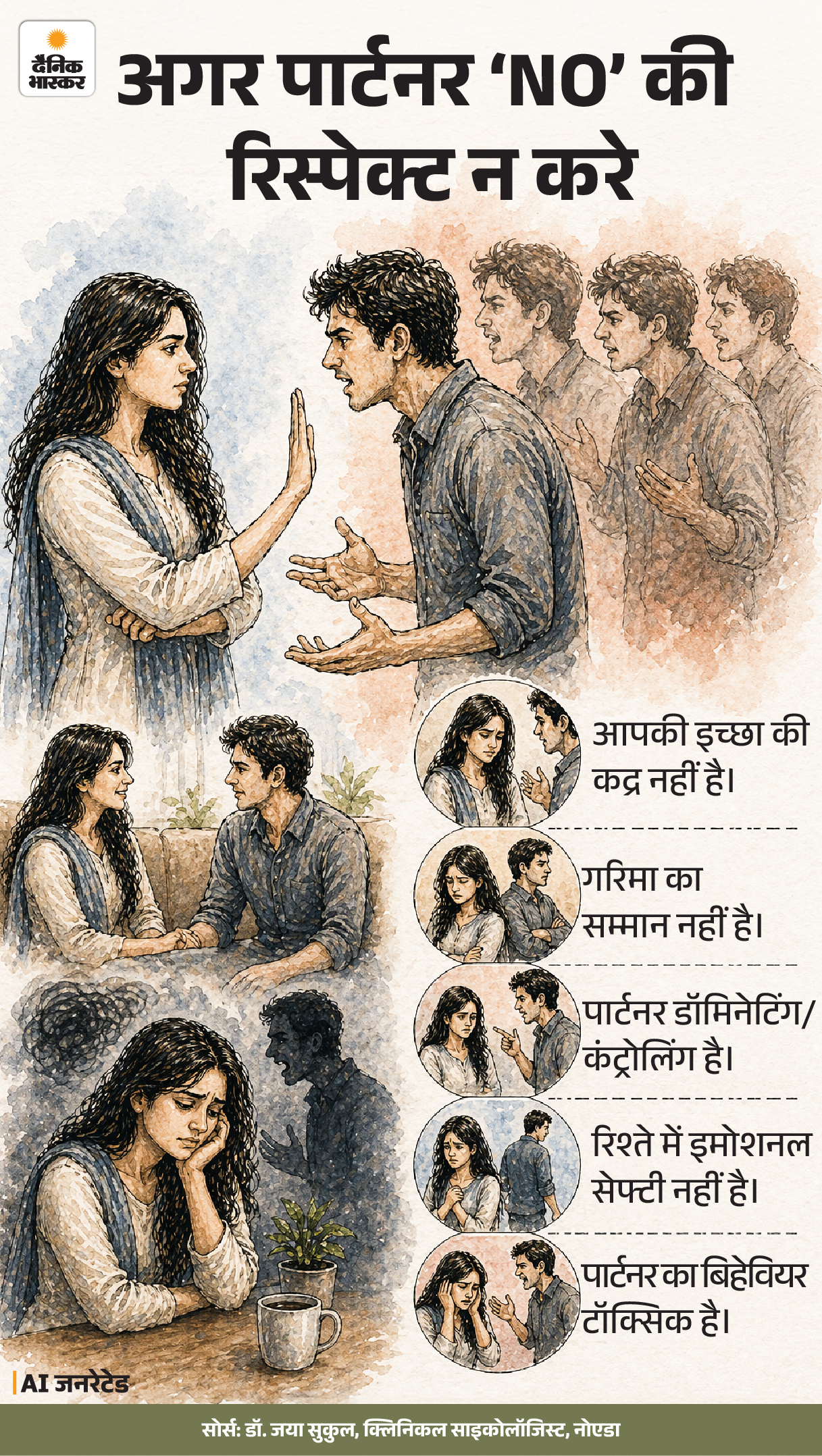 इंटीमेसी कोई ‘रिलेशनशिप टेस्ट’ नहीं है, जिसे पास करना जरूरी ही है। एक हेल्दी रिश्ते में ‘ना’ का सम्मान, ‘हां’ से भी ज्यादा जरूरी है। अगर आप तैयार नहीं हैं तो दबाव में लिया गया कोई भी फैसला आपकी मेंटल हेल्थ और रिश्ते, दोनों को नुकसान पहुंचा सकता है। आइए आपकी सिचुएशन को समझते हैं और सॉल्यूशन पर बात करते हैं। सबसे पहले ‘NO’ का मतलब समझिए-