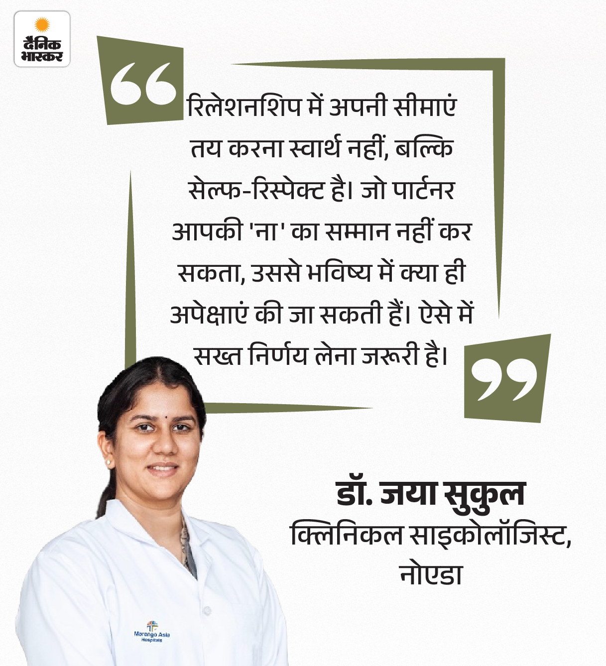 रिलेशनशिप में अपनी सीमाएं तय करना स्वार्थ नहीं, बल्कि सेल्फ-रिस्पेक्ट है। जो पार्टनर आपकी ‘ना’ का सम्मान नहीं कर सकता, उससे भविष्य में हेल्दी रिलेशनशिप की उम्मीद करना मुश्किल है।