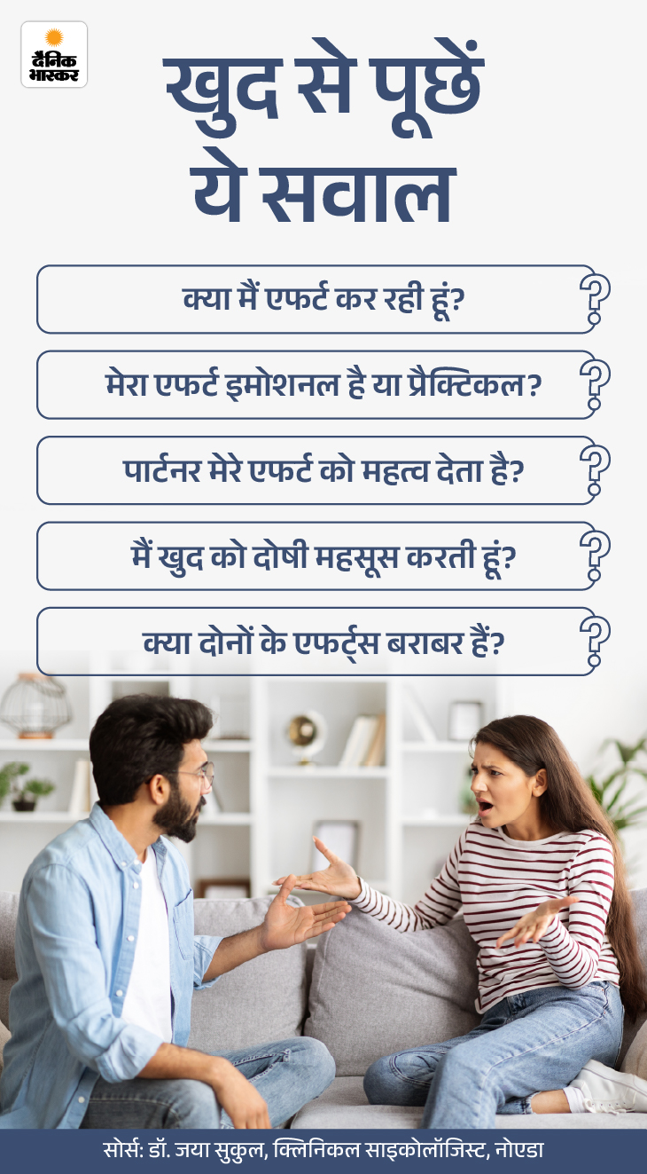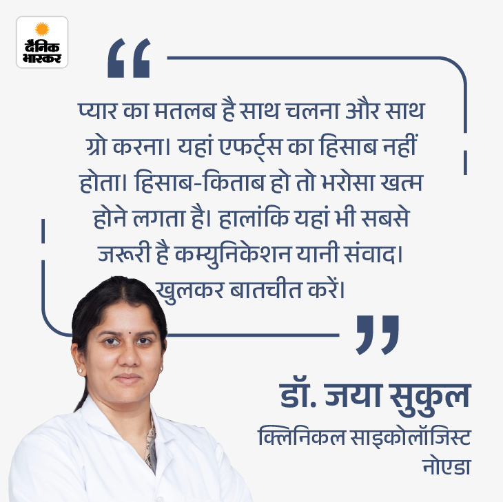 कई बार ऐसा होता है कि एक पार्टनर का एफर्ट दिखता है, दूसरे का सिर्फ महसूस होता है। कई बार इमोशंस को वैल्यू नहीं मिलती, तो गिनती शुरू हो जाती है। आप तीन साल से साथ हैं, तो शायद आपके एफर्ट्स इमोशनल हैं, जैसे पार्टनर को सुनना, सपोर्ट करना, जो नजर नहीं आते हैं। लेकिन वो महत्वपूर्ण हैं।