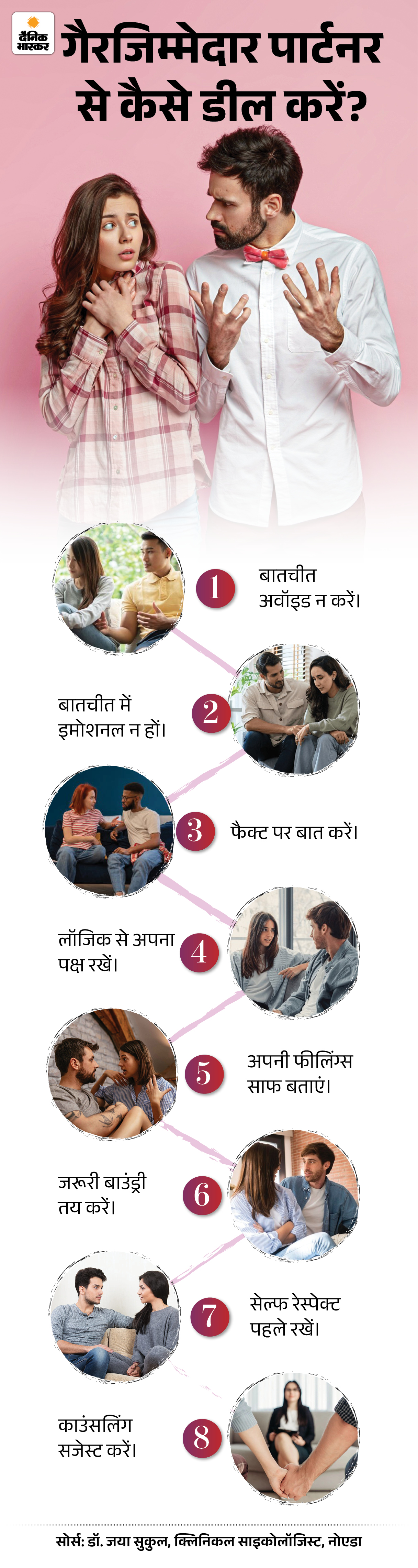 जवाब- क्लिनिकल रिसर्च बताती हैं कि रिलेशनशिप या फैमिलीज के भीतर गैरजिम्मेदार एटीट्यूड गंभीर इमोशनल स्ट्रेस का कारण हो सकता है। आपने अपने इमोशनल स्ट्रेस को बेहतर ढंग से आर्टिकुलेट किया है। आपके रिश्ते में प्यार, बॉन्डिंग और केमिस्ट्री अच्छी है, लेकिन फिर भी पार्टनर का गैरजिम्मेदाराना व्यवहार और उसकी हमेशा लेट होने की आदत तनाव पैदा कर रही है। आपका सवाल पूछना ही बताता है कि यह एक गंभीर बात है, जिसे आप नजरअंदाज नहीं कर पा रही हैं।