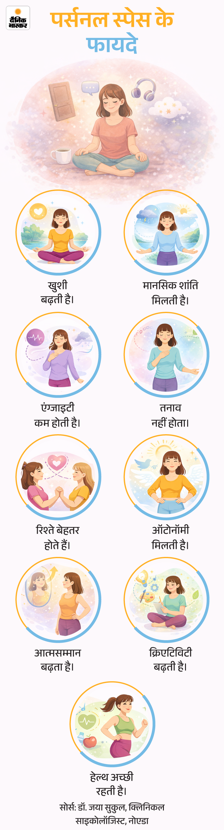पर्सनल स्पेस में इंसान अपने इमोशंस को बेहतर ढंग से प्रोसेस करना सीखता है। वह खुशी और दुख को पहचानकर उनसे डील करना सीखता है। नकारात्मकता और एंग्जाइटी से निपटना सीखता है। इसका सकारात्मक असर उसके सभी रिश्तों पर पड़ता है। पर्सनल स्पेस के फायदे ग्राफिक में देखिए-