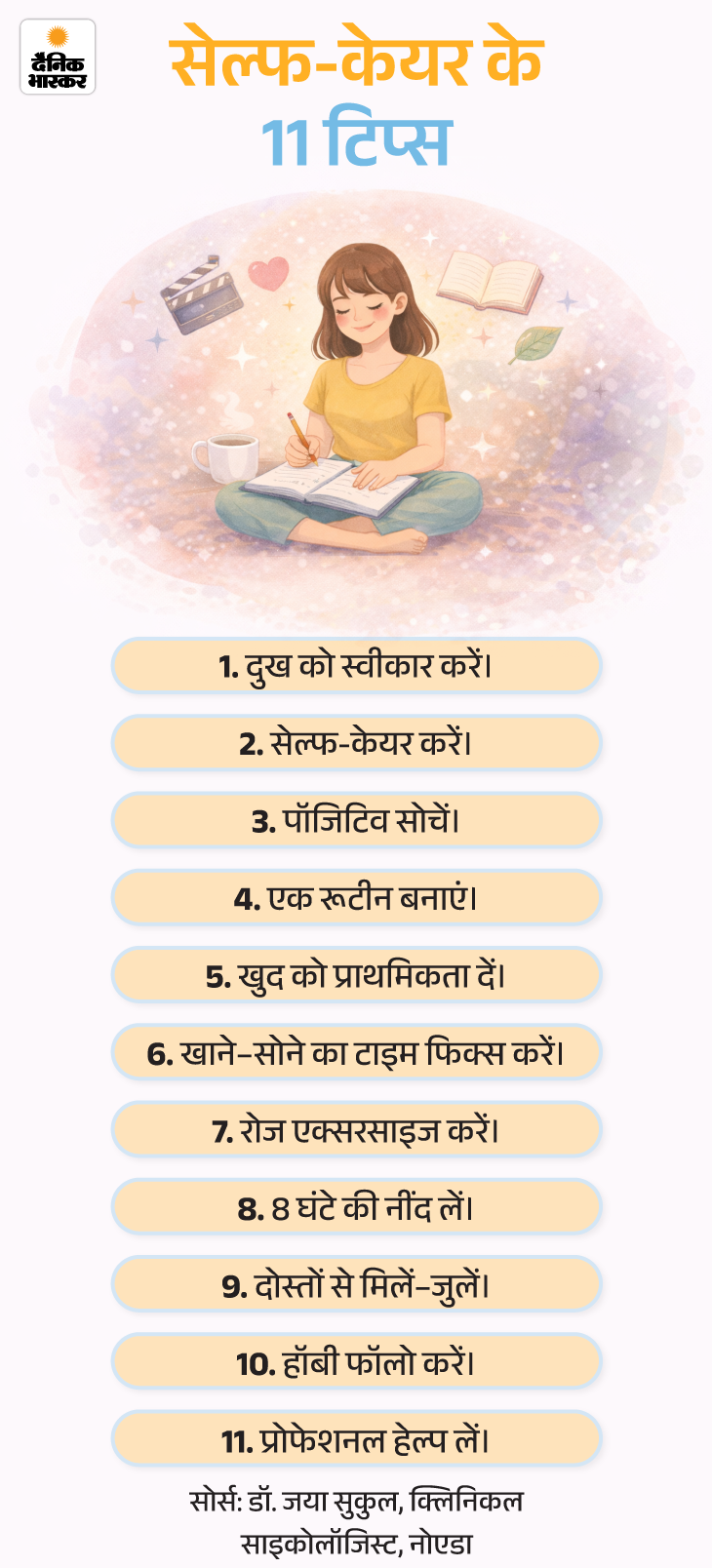 इस तरह की मुश्किल से गुजरते हुए खुद का ख्याल रखना बहुत जरूरी है। इस फेज में आप थकान महसूस कर सकती हैं। इसलिए सेल्फ-केयर रूटीन बनाएं। हेल्दी खाना खाएं, नींद पूरी करें, दोस्तों से बात करें। अगर जरूरत लगे तो काउंसलर से कंसल्ट करें।