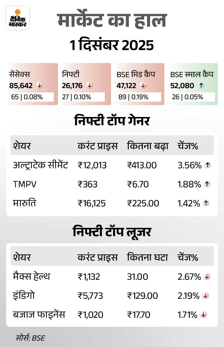 रुपए में गिरावट का घरेलू इक्विटी मार्केट्स पर भी नेगेटिव असर पड़ा। आज सेंसेक्स 64 गिरकर 85,641.90 के स्तर पर बंद हुआ। निफ्टी भी 27 अंक गिरा, ये 26,175.75 के स्तर पर बंद हुआ।