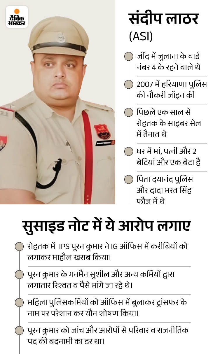 • 14 अक्टूबर को एएसआई संदीप लाठर ने सुसाइड कियाः अभी वाई पूरन कुमार के पोस्टमॉर्टम व संस्कार को लेकर गतिरोध चल ही रहा था, कि 14 अक्टूबर को रोहतक में एएसआई संदीप लाठर ने खुद को गोली मारकर सुसाइड कर लिया। 4 पेज का लास्ट नोट व वीडियो रिकॉर्ड किया। जिसमें पूरन कुमार को भ्रष्ट अफसर बताया।
