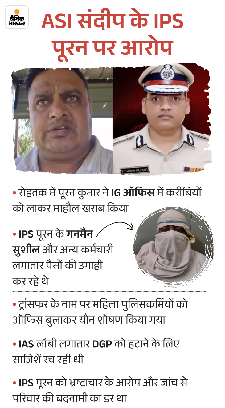 • 6 अक्टूबर को आईपीएस का गनमैन गिरफ्तारः रोहतक पुलिस ने एक शराब कारोबारी की शिकायत पर 6 अक्टूबर को एफआईआर दर्ज की। जिसमें मंथली के लिए दबाव बनाने का आरोप लगाया। उसी दिन पुलिस ने आईपीएस वाई पूरन कुमार के गनमैन सुशील कुमार की ऑन रिकॉर्ड गिरफ्तारी दिखाई। गनमैन को गिरफ्तार करने वाली टीम में एएसआई संदीप लाठर भी था।