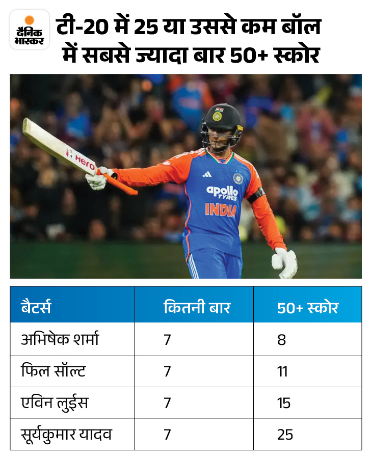 2. अभिषेक ने 25 से कम बॉल में 7वीं बार 50+ स्कोर किया अभिषेक शर्मा ने 7वीं बार 25 या उससे कम बॉल पर 50+ रन बनाए। वे अब तक अपने करियर में 6 फिफ्टी और 2 सेंचुरी लगा चुके हैं। इंग्लैंड के फिल सॉल्ट भी 7 बार ऐसा कर चुके हैं।