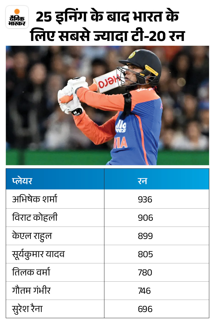 1. अभिषेक ने कोहली को पीछे छोड़ा अभिषेक 25 इनिंग के बाद सबसे ज्यादा रन बनाने वाले इंडियन बैटर बन गए हैं। उनके नाम अब 936 रन हो गए। अभिषेक से पहले यह रिकॉर्ड विराट कोहली के नाम था। उन्होंने 25 पारियों के बाद 906 रन बनाए थे।