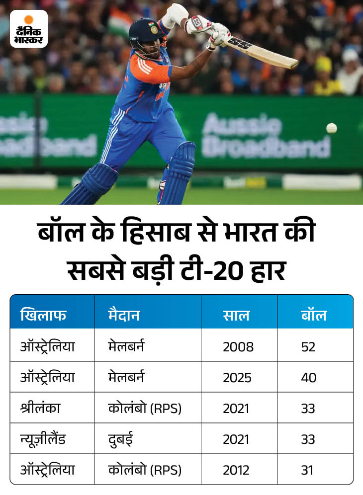 5. बॉल के हिसाब से भारत की दूसरी सबसे बड़ी टी-20 हार बॉल बाकी रहने के हिसाब से टी-20 में भारत की दूसरी सबसे बड़ी हार रही। टीम शुक्रवार को 40 गेंद बाकी रहते हार गई। इससे पहले 2008 में मेलबर्न में ही टीम इंडिया ऑस्ट्रेलिया के खिलाफ 58 गेंदें रहते हार गई थी।