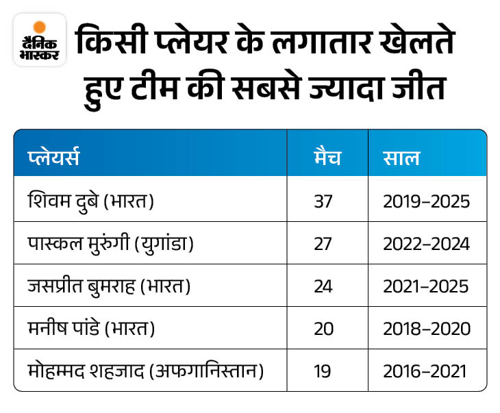 दुबे के बाद यह रिकॉर्ड युगांडा के बल्लेबाज पास्कल मुरुंगी के नाम है। उनके खेलते हुए टीम 26 मैच नहीं हारी थी। तीसरे नंबर पर भारत के जसप्रीत बुमराह हैं। उनके रहते भारत 24 मैच जीता था।