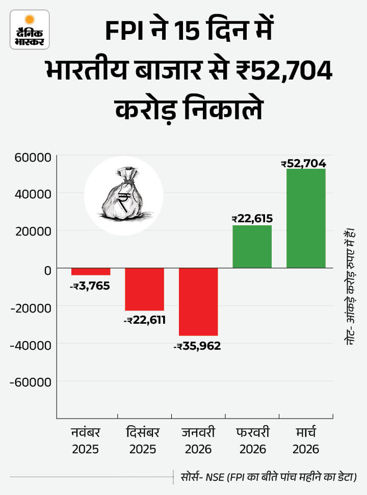 भारतीय शेयर बाजार में फॉरेन पोर्टफोलियो इन्वेस्टमेंट (FPIs) की बिकवाली लगातार जारी है। मार्च के शुरुआती दो हफ्तों में विदेशी निवेशकों ने घरेलू इक्विटी बाजार से 52,704 करोड़ रुपए निकाले हैं। यह बिकवाली ऐसे समय में हुई है, जब मिडल ईस्ट में तनाव बढ़ रहा है और कच्चा तेल 100 डॉलर प्रति बैरल के पार निकल गया है।