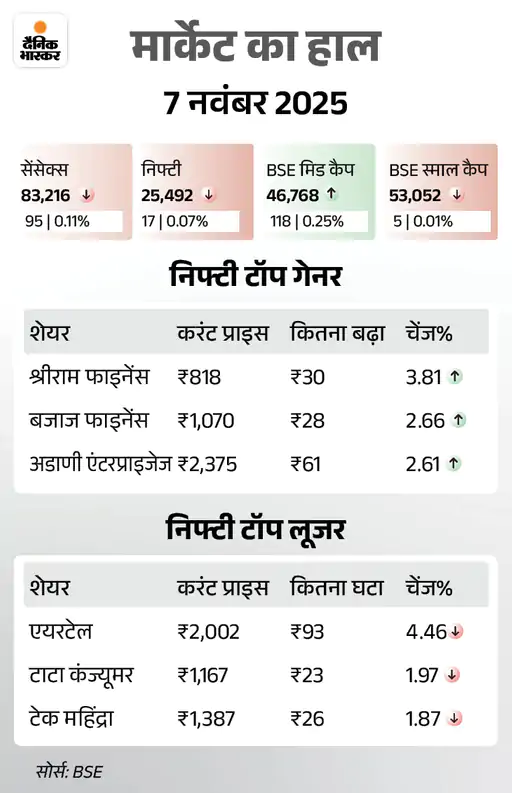 हफ्ते के आखिरी कारोबारी दिन शुक्रवार, 7 नवंबर को सेंसेक्स 95 गिरकर 83,216 पर बंद हुआ। निफ्टी में भी 17 अंक की गिरावट रही, ये 25,492 के स्तर पर बंद हुआ। आज बाजार में 600 अंक तक गिरावट थी।