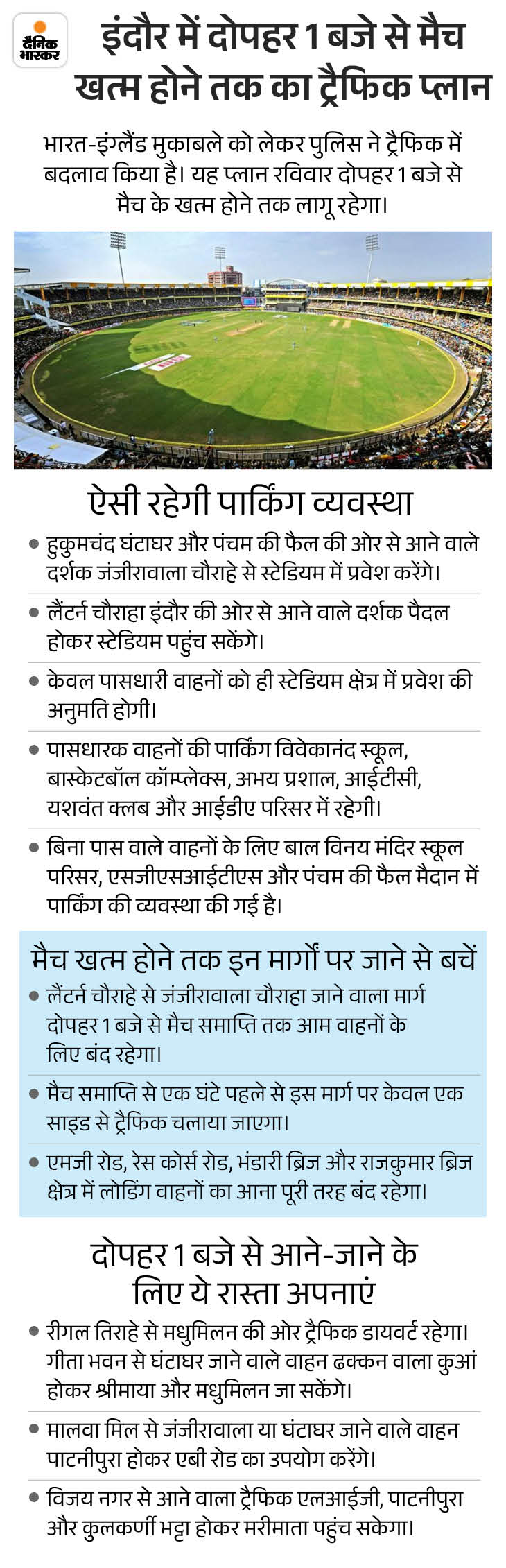 तीन गेटों से ही मिलेगी एंट्री मैच दोपहर 3:00 बजे शुरू होगा। दर्शकों को 12:30 बजे तक स्टेडियम पहुंचने की सलाह दी गई है। स्टेडियम में 8 गेट हैं लेकिन उषा राजे, सतीश मल्होत्रा समेत 3 गेटों से ही एंट्री होगी।