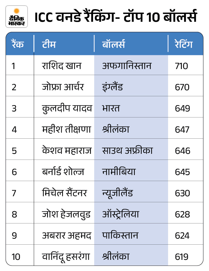 मोहम्मद सिराज को बॉलिंग में फायदा गेंदबाजी रैंकिंग में भारत के मोहम्मद सिराज ने कमाल किया और 5 स्थान की छलांग लगाते हुए 15वें पायदान पर पहुंच गए। उनके साथ इस स्थान पर बांग्लादेश के मेहदी हसन मिराज भी मौजूद हैं। वहीं, अफगानिस्तान के ऑलराउंडर राशिद खान टॉप बॉलर हैं।