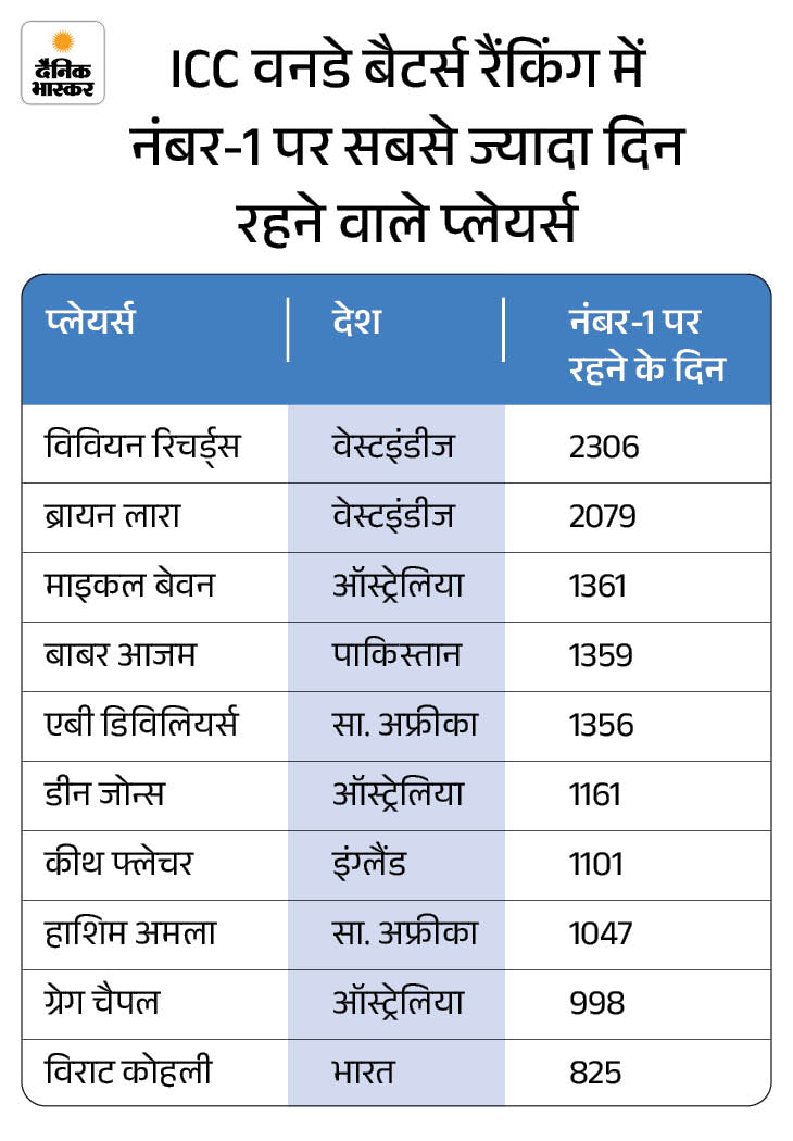 विराट 825 दिन तक नंबर-1 स्पॉट पर रहे विराट ने अक्टूबर 2013 में पहली बार टॉप रैंकिंग हासिल की थी। विराट कुल मिलाकर 825 दिनों तक नंबर-1 स्थान पर रह चुके हैं। कोई अन्य भारतीय बल्लेबाज वनडे में इतने दिनों तक नंबर-1 नहीं रहा है। दुनिया में वे इस मामले में 10वें स्थान पर हैं।