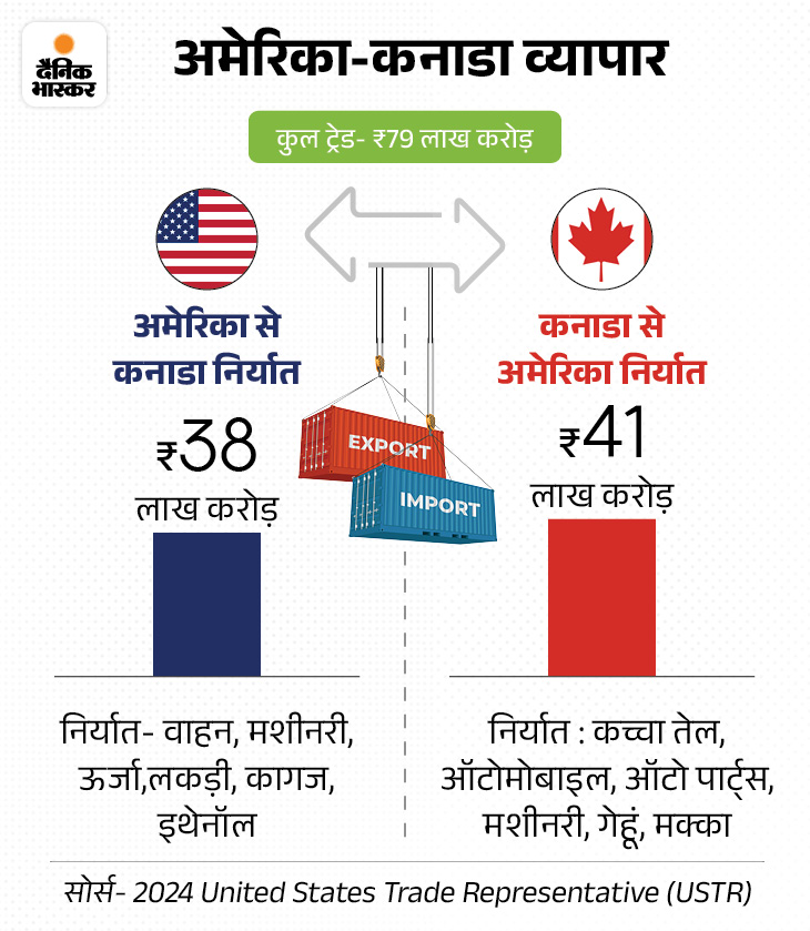 फिलहाल कनाडा अपने करीब 70% निर्यात के लिए अमेरिका पर निर्भर है। मौजूदा समझौते के तहत दोनों देशों के बीच करीब 85% व्यापार बिना किसी टैरिफ के होता है। एक्सपर्ट्स का कहना है कि अगर ट्रम्प ने इस छूट को खत्म करने की धमकी भी दी, तो इससे कनाडा की अर्थव्यवस्था को भारी नुकसान हो सकता है।
