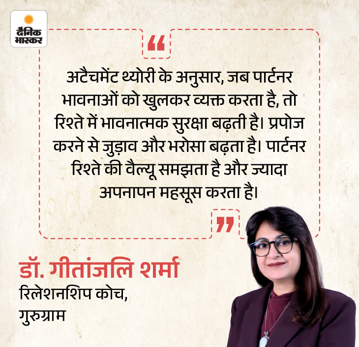 रिलेशनशिप एक्सपर्ट डॉ. गीतांजलि शर्मा कहती हैं कि अच्छा प्रपोजल सिर्फ रोमांटिक पलों के लिए नहीं है। यह रिश्ते में भरोसा, समझ और इमोशनल कनेक्शन भी बिल्ड करता है। प्रपोजल का महंगा या भव्य होना जरूरी नहीं है। जरूरी ये है कि उसमें भावनाओं की सच्चाई हो और पार्टनर की पसंद का ख्याल रखा जाए।