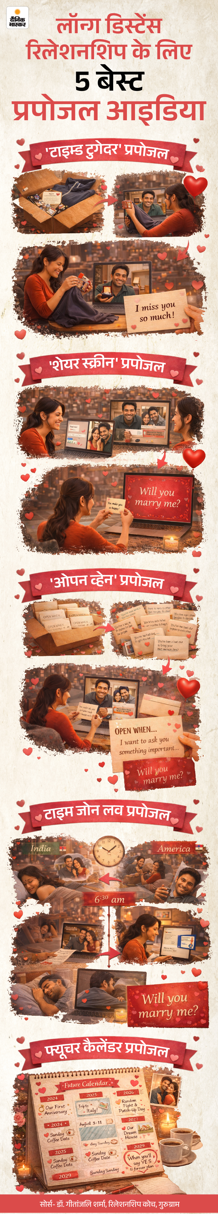 अगर आप और आपके पार्टनर अलग-अलग टाइम जोन (जैसे भारत-अमेरिका) में रहते हैं, तो यह आइडिया बेहद खास बन सकता है। आप एक डिजिटल टाइमलाइन बनाकर दिखा सकते हैं कि अलग-अलग समय होने के बावजूद आपकी लाइफस्टाइल एक-दूसरे से कैसे जुड़ी हुई है।
