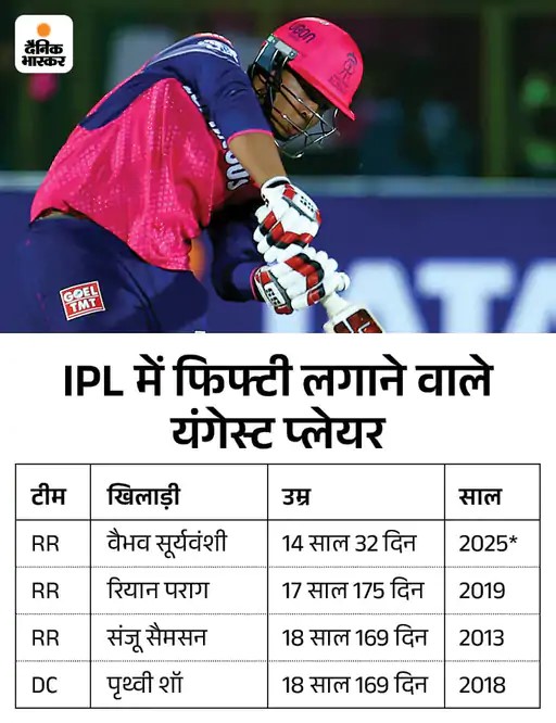 वैभव IPL में फिफ्टी लगाने वाले यंगेस्ट प्लेयर वैभव सूर्यवंशी IPL में फिफ्टी लगाने वाले सबसे कम उम्र के प्लेयर बने। उन्होंने मात्र 14 साल और 32 दिन में अर्धशतक लगाया। सेकेंड पोजिशन पर कप्तान रियान पराग है, उन्होंने 17 साल 175 दिन में 2019 में फिफ्टी लगाई थी।