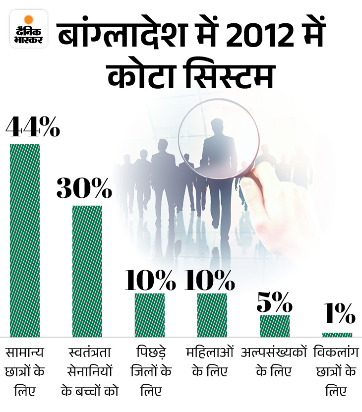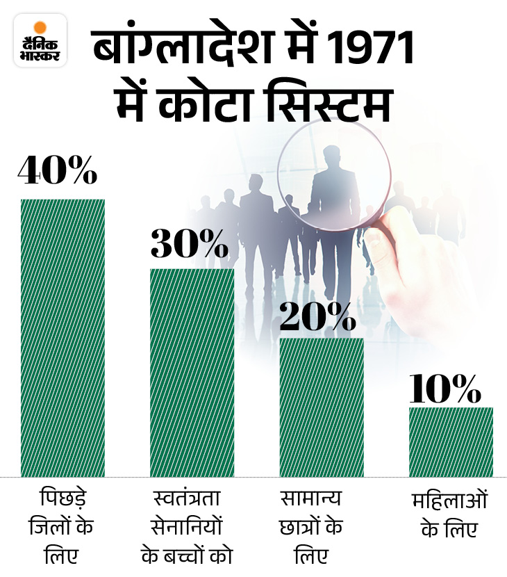बांग्लादेश 1971 में आजाद हुआ था। इसी साल वहां पर 80 फीसदी कोटा सिस्टम लागू हुआ। बांग्लादेशी अखबार द डेली स्टार की रिपोर्ट के मुताबिक, इसमें स्वतंत्रता सेनानियों के बच्चों को नौकरी में 30%, पिछड़े जिलों के लिए 40%, महिलाओं के लिए 10% आरक्षण दिया गया। सामान्य छात्रों के लिए सिर्फ 20% सीटें रखी गईं।