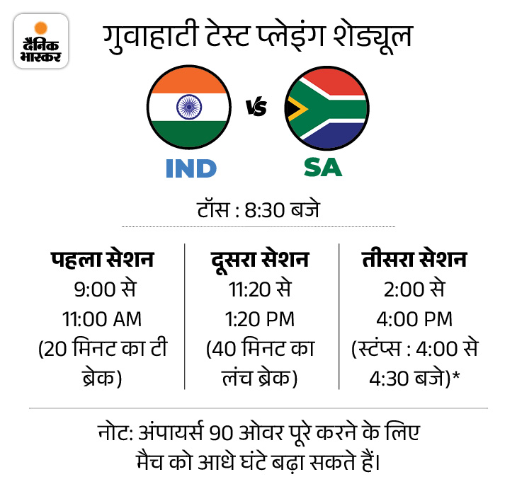 गुवाहाटी में पहली बार टेस्ट मैच होगा भारत और साउथ अफ्रीका के बीच पहला टेस्ट 14 नवंबर से कोलकाता में और दूसरा टेस्ट 22 नवंबर से गुवाहाटी में खेला जाएगा। यह पहला मौका होगा, जब गुवाहाटी में कोई टेस्ट मैच खेला जाएगा। इस मुकाबले में पहली बार लंच से पहले टी सेशन होगा। टेस्ट में आमतौर पर लंच के बाद टी सेशन होता है।