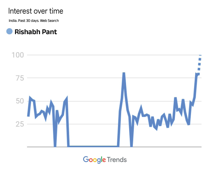 टेस्ट टीम में वापसी के बाद ऋषभ पंत गूगल के टॉप ट्रेंड पर आ गए हैं। उन्हें सर्च किया जाने लगा है। नीचे गूगल ट्रेंड देखिए