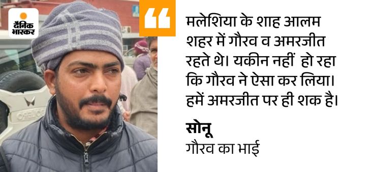 - परिवार को कहा कि मेरा नाम मत लेनाः सोनू के मुताबिक, अमरजीत ने घटना वाले दिन फोन कर बताया कि गौरव ने आत्महत्या कर ली है। किसी के पूछने पर यह कहना कि परिवार के साथ झगड़ा चल रहा था, पर मेरा नाम मत लेना। अमरजीत कौर ने भी परिवार को कुछ स्पष्ट नहीं बताया है और न ही मलेशिया पुलिस ने परिवार से संपर्क किया।