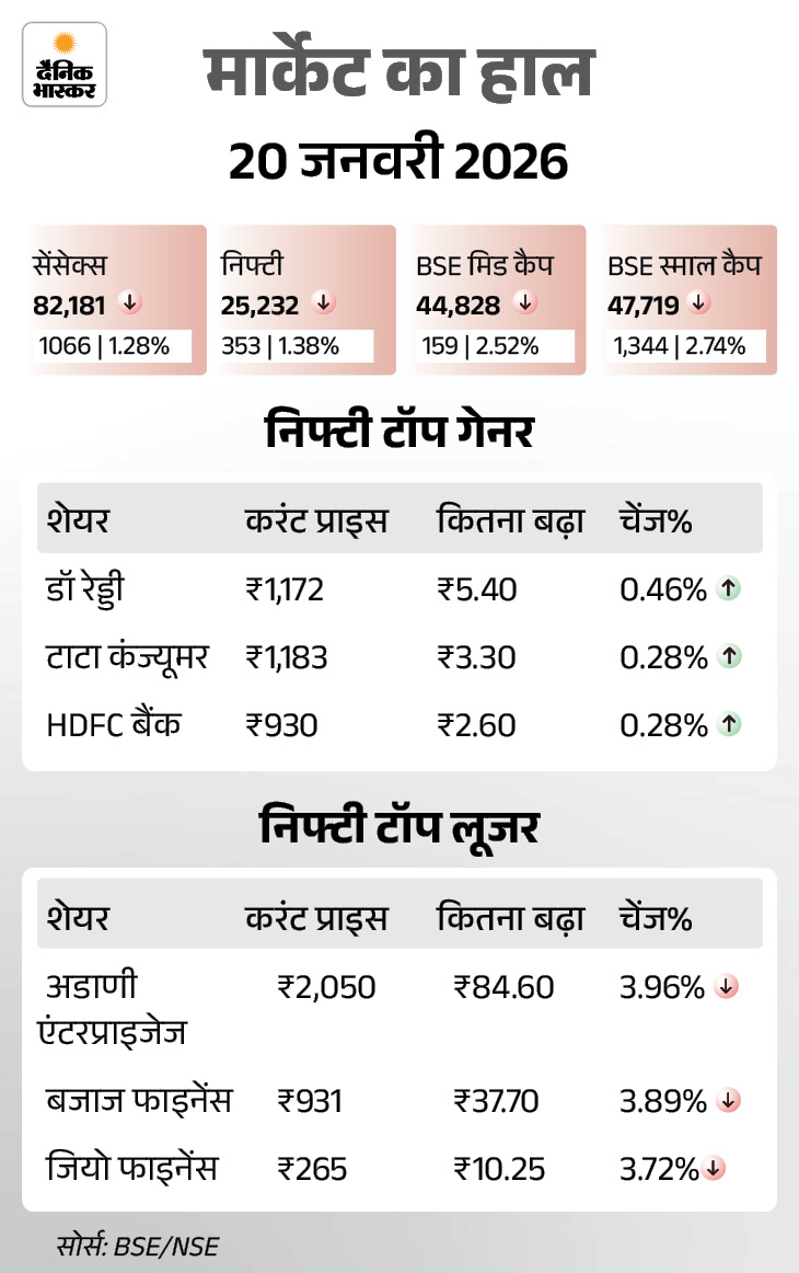 मंगलवार 20 जनवरी को सेंसेक्स 1065 अंक (1.28%) गिरकर 82,180 पर बंद हुआ। निफ्टी में भी 353 अंक (1.38%) की गिरावट रही। ये 25,233 के स्तर पर आ गया।