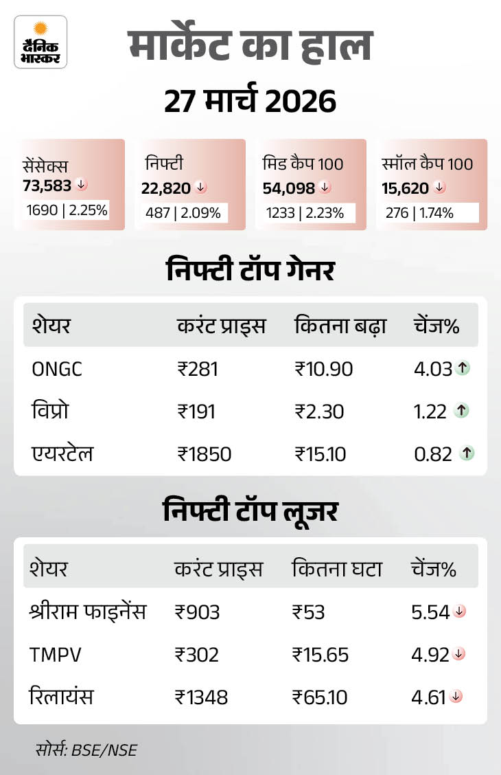 इससे पहले शुक्रवार यानी 27 मार्च को शेयर बाजार में गिरावट रही थी। सेंसेक्स 1690 अंक (2.25%) की गिरावट के साथ 73,583 पर बंद हुआ था। वहीं निफ्टी में भी 486 अंक (2.09%) की गिरावट रही थी, ये 22,820 पर बंद हुआ था।