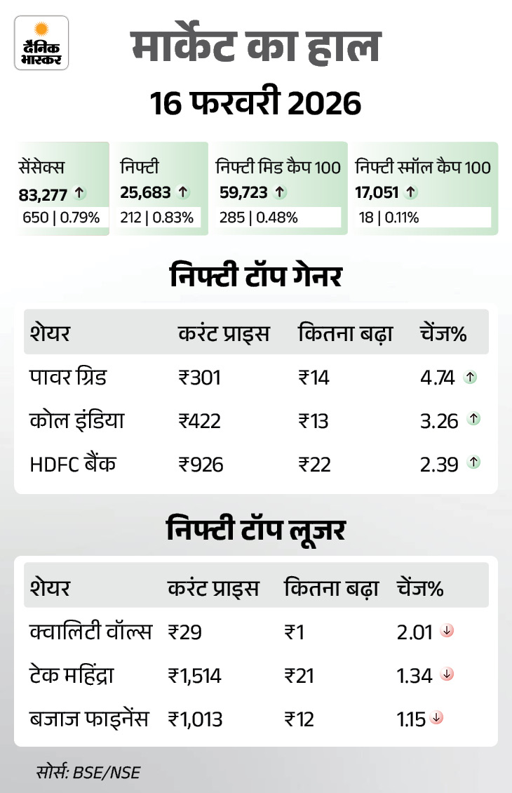 कल बाजार में रही थी बढ़त शेयर बाजार में कल यानी 16 फरवरी को बढ़त रही। सेंसेक्स 650 अंक की तेजी के साथ 83,277 पर बंद हुआ था। निफ्टी में 212 अंक की बढ़त रही, ये 25,683 पर बंद हुआ था।