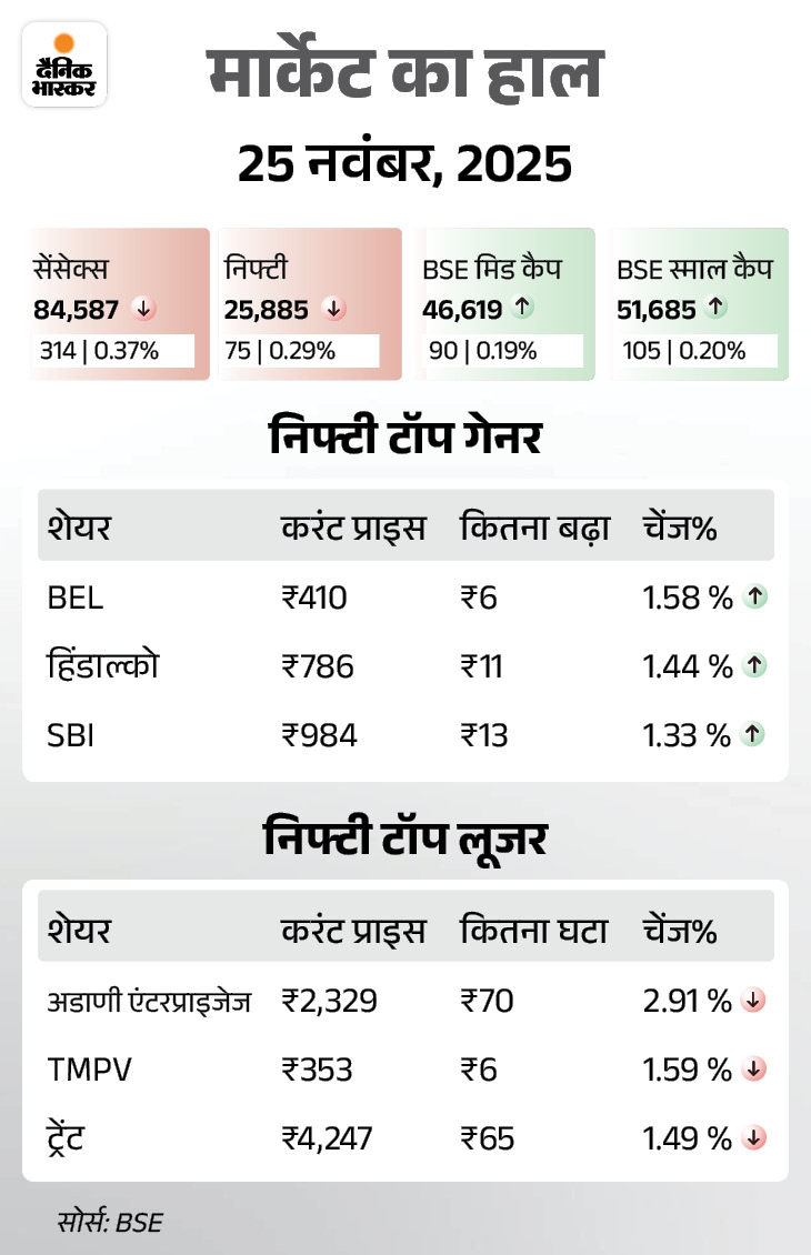 कल बाजार में रही थी गिरावट इससे पहले कल यानी 25 नवंबर को शेयर बाजार में गिरावट रही थी। सेंसेक्स 314 अंक गिरकर 84,587 पर बंद हुआ था। वहीं निफ्टी में 75 अंक की गिरावट रही थी, ये 25,885 पर बंद हुआ था।