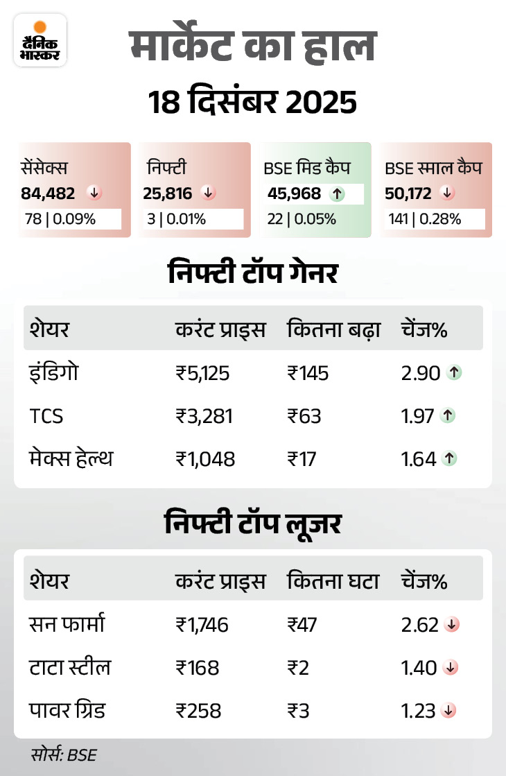 शेयर बाजार में 18 दिसंबर को फ्लैट कारोबार देखने को मिला। सेंसेक्स 78 अंक गिरकर 84,482 पर बंद हुआ। निफ्टी में 3 अंक की गिरावट रही, ये 25,816 पर बंद हुआ।
