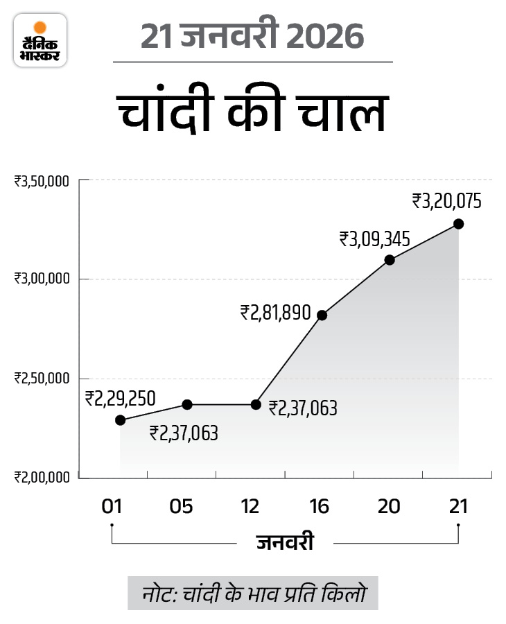 वहीं 1 किलो चांदी की कीमत आज 10,730 रुपए बढ़कर 3,20,075 रुपए पर पहुंच गई है। इससे पहले कल ये 3,09,345 रुपए पर थी। चांदी इस साल सिर्फ 21 दिनों में ही 90,825 रुपए महंगी हो चुकी है। सोने-चांदी के दाम लगातार तीसरे दिन अपने ऑलटाइम हाई पर हैं।