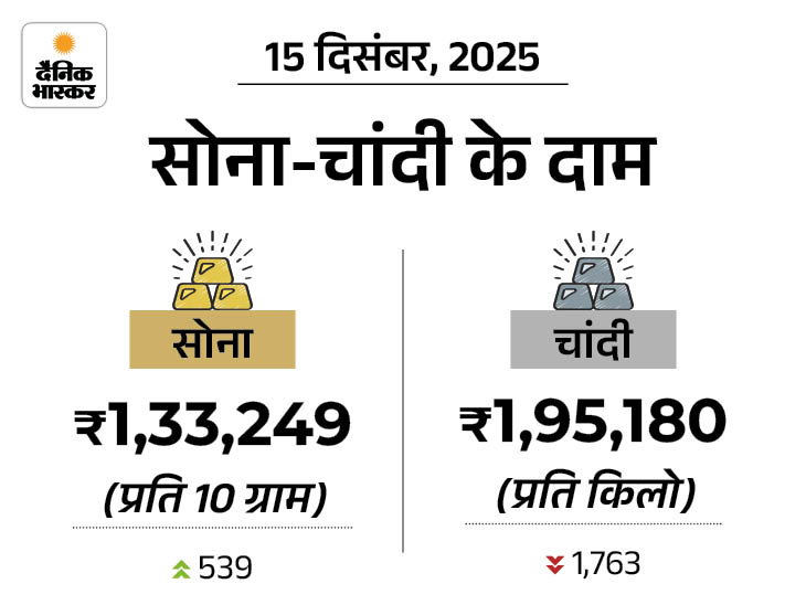 वहीं, चांदी के दाम में आज गिरावट है। 1,763 रुपए गिरकर 1,93,417 रुपए किलो हो गई है। इससे पहले ये 1,95,180 रुपए पर थी। ये इसका ऑल टाइम हाई भी है।