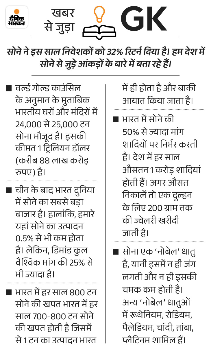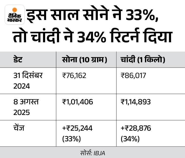 सोना इस साल अब तक ₹25,244 महंगा हुआ इस साल यानी 1 जनवरी से अब तक 10 ग्राम 24 कैरेट सोने का दाम 76,162 रुपए से 25,244 रुपए बढ़कर 1,01,406 रुपए पर पहुंच गया है। वहीं, चांदी का भाव भी 86,017 रुपए प्रति किलो से 28,876 रुपए बढ़कर 1,14,893 रुपए पर पहुंच गया है। वहीं पिछले साल यानी 2024 में सोना 12,810 रुपए महंगा हुआ था।