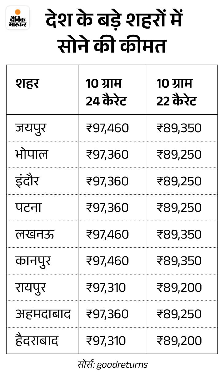 - दिल्ली : 10 ग्राम 24 कैरेट सोने की कीमत 97,460 रुपए और 10 ग्राम 22 कैरेट सोने की कीमत 89,350 रुपए है।