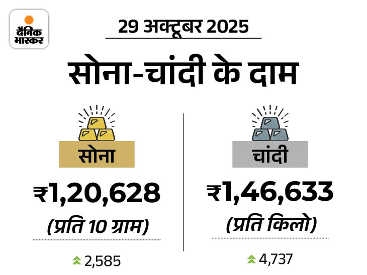 कल की बड़ी खबर सोना-चांदी से जुड़ी रही। इंडिया बुलियन एंड ज्वेलर्स एसोसिएशन (IBJA) के अनुसार 10 ग्राम सोने की कीमत 2,585 रुपए बढ़कर 1,20,628 रुपए पहुंच है। 20 से 28 अक्टूबर तक सोने के दाम 11,541 रुपए गिरे थे।