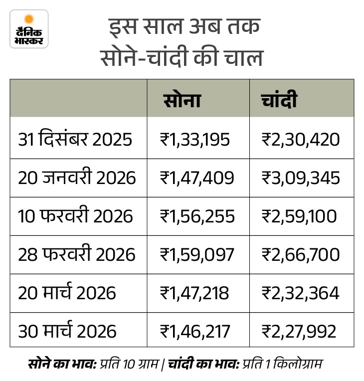 इस साल सोने की कीमत में तेजी देखने को मिली है। बीते साल के आखिर में सोना 1.33 लाख रुपए प्रति 10 ग्राम पर था, जो अब 1.46 लाख रुपए पर है। यानी इसकी कीमत इस साल अब तक 22 हजार बढ़ चुकी है। हालांकि चांदी की कीमत में 2 हजार की कमी आई है।