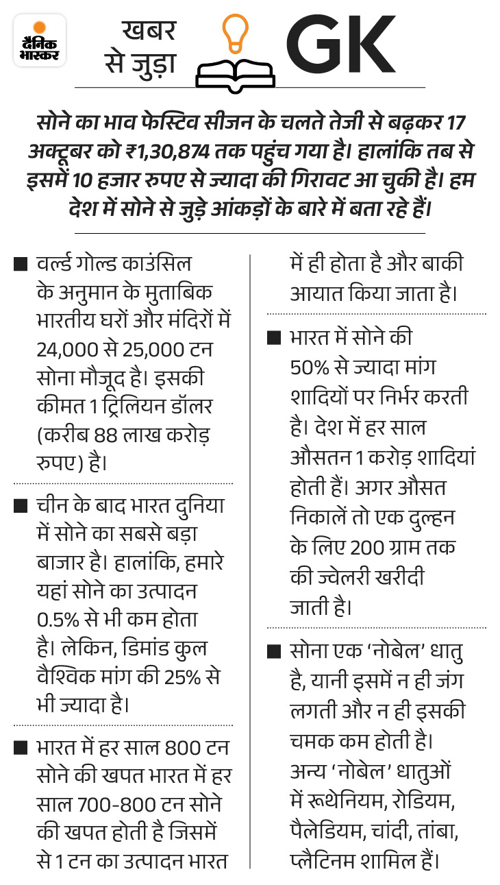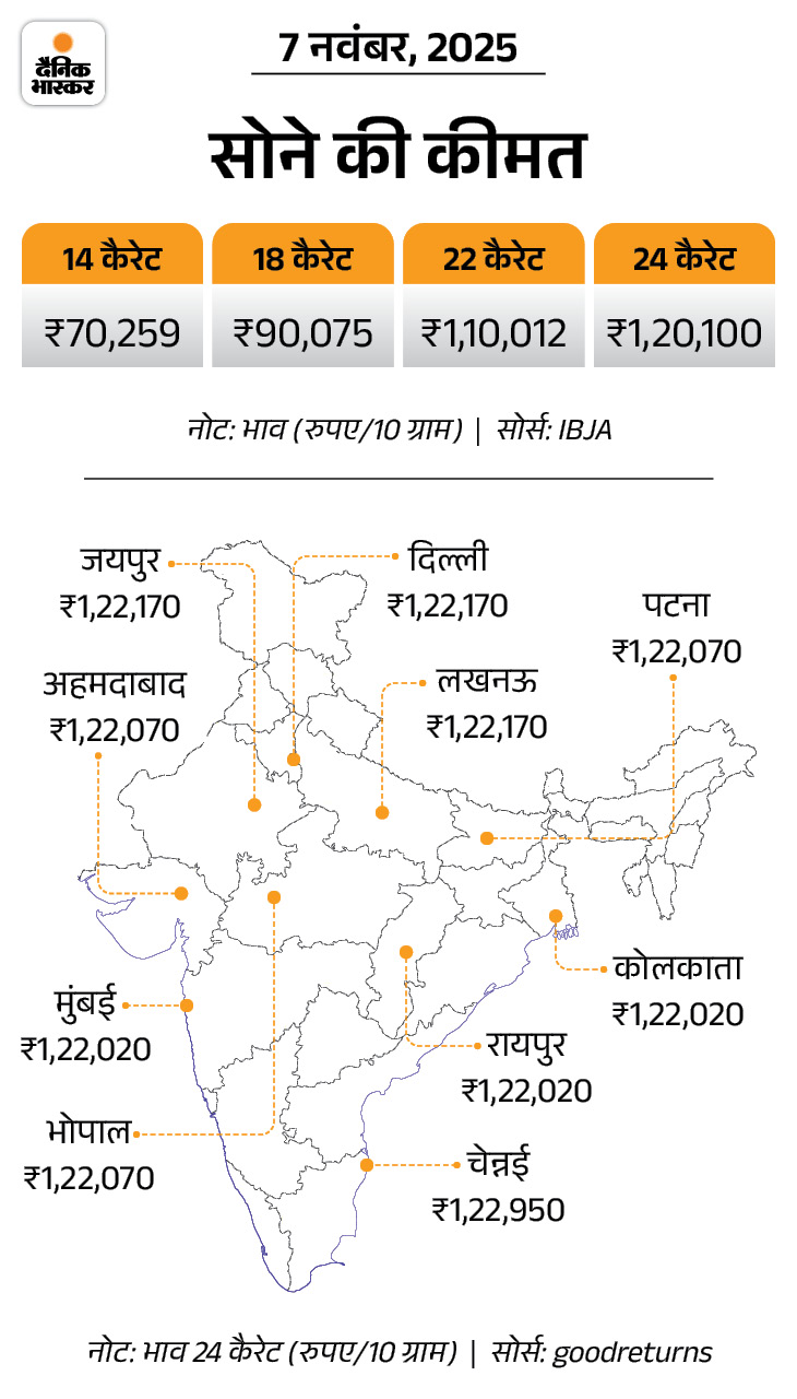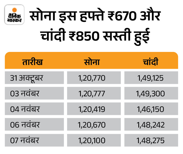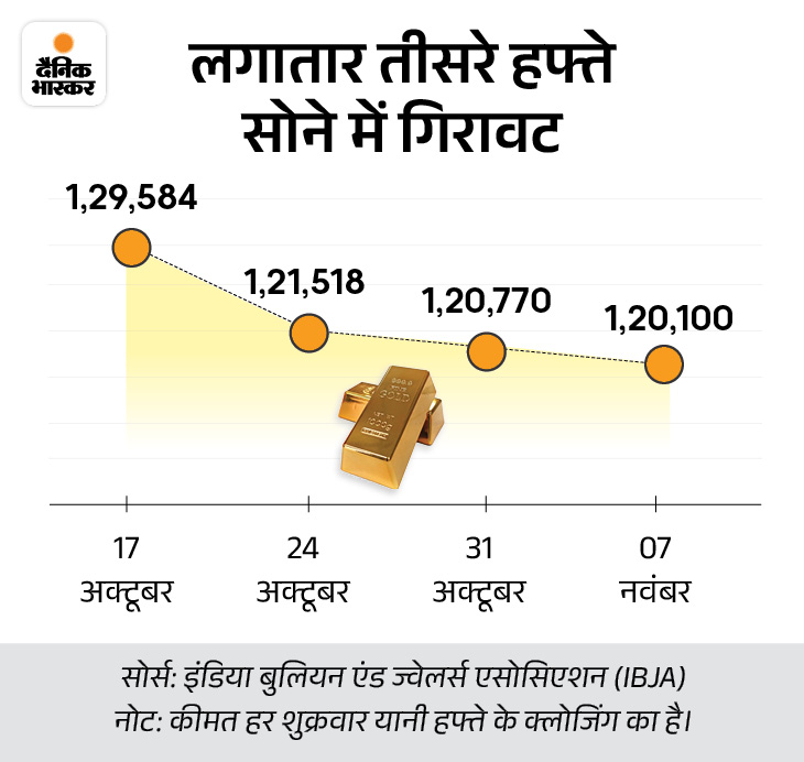 इस हफ्ते सोने-चांदी के दाम में गिरावट रही। इंडिया बुलियन एंड ज्वेलर्स एसोसिएशन (IBJA) के अनुसार 31 अक्टूबर को सोना ₹1,20,770 प्रति 10 ग्राम पर था, जो 7 नवंबर तक 670 रुपए कम होकर 1,20,100 रुपए पर आ गया। यह लगातार तीसरा सप्ताह है जब सोने का भाव गिरा है। 17 अक्टूबर को सोना ₹1,29,584 प्रति 10 ग्राम पर था।