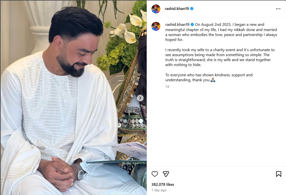 IPL में गुजरात टाइटंस से खेलने वाले राशिद ने लिखा- ‘2 अगस्त 2025 को मैंने अपने जीवन का एक नया अध्याय शुरू किया। मेरा निकाह हुआ और मैंने एक ऐसी महिला से शादी की जो उस प्यार, शांति और साझेदारी का प्रतीक है, जिसकी मुझे हमेशा से उम्मीद थी।’
