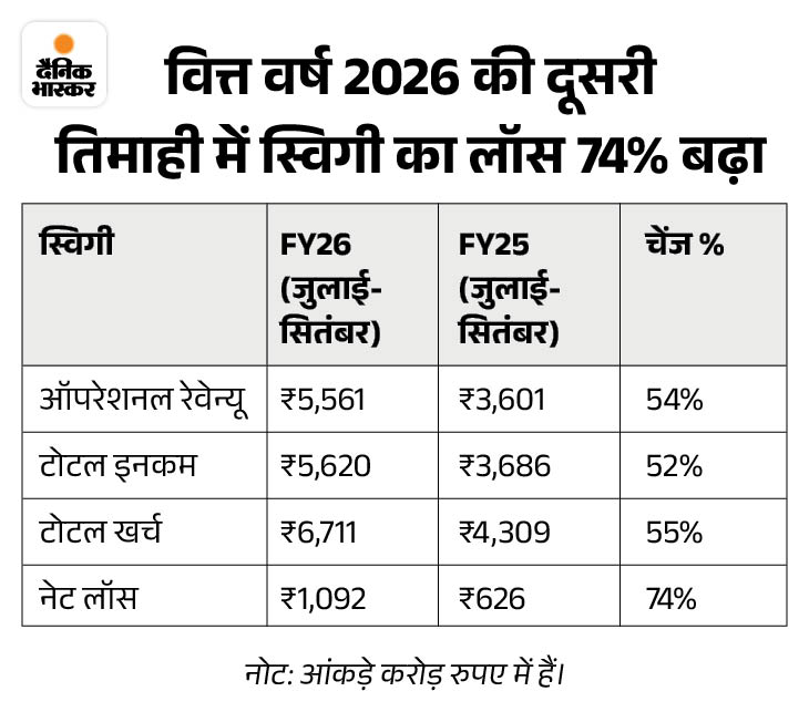 ऑनलाइन फूड डिलीवरी प्लेटफॉर्म स्विगी का जुलाई-सितंबर तिमाही में नेट लॉस यानी शुद्ध घाटा सालाना आधार पर 74% बढ़कर ₹1,092 करोड़ रहा। पिछले साल की समान तिमाही में कंपनी को ₹626 करोड़ का घाटा हुआ था। वहीं कंपनी के ऑपरेशनल रेवेन्यू में भी 54% की बढ़ोतरी हुई है।