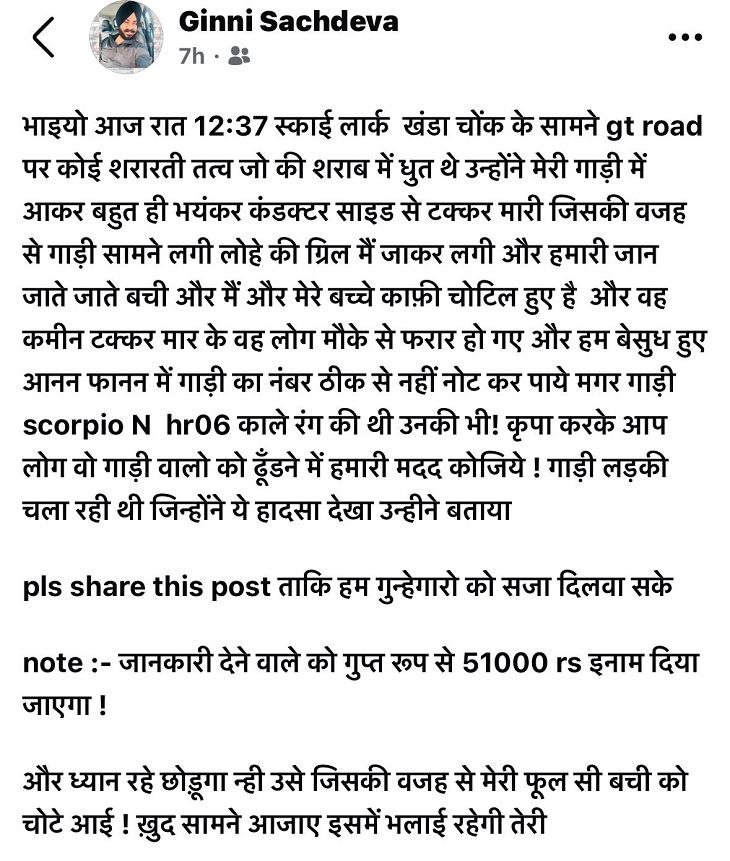 देर रात इलाज करवाने के बाद पीड़ित घर आ गए। अगली सुबह मामले की शिकायत पुलिस को देने के साथ पीड़ित ने अपने सोशल मीडिया अकाउंट पर एक पोस्ट डाली। उसमें लिखा था, ‘भाइयों आज रात 12:37 बजे स्काईलार्क खंडा चौक के सामने जीटी रोड पर किसी शरारती तत्व, जोकि नशे में धुत था, ने मेरी गाड़ी में भयंकर टक्कर मारी। इससे गाड़ी सामने लगी लोहे की ग्रिल में जाकर टकराई।