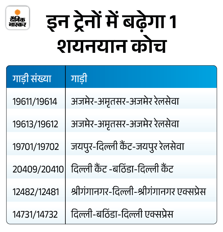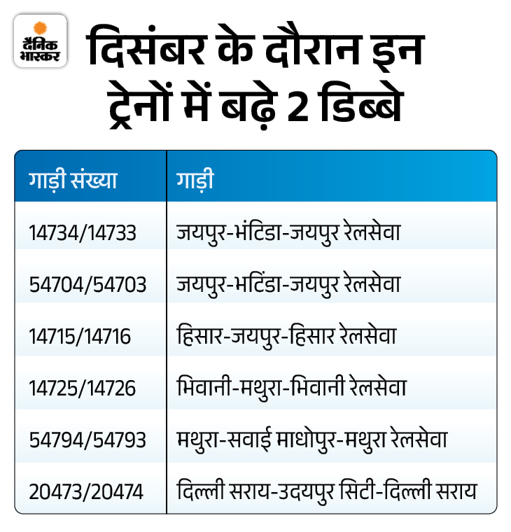 - गाड़ी संख्या 12985/12986, जयपुर-दिल्ली सराय- जयपुर रेलसेवा 1 वातानुकूलित कुर्सीयान श्रेणी डिब्बे की अस्थाई बढ़ोतरी रहेगी।