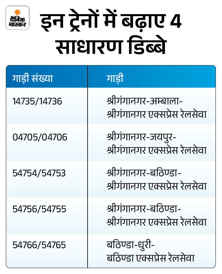- गाड़ी संख्या 14719/14720, बीकानेर-अमृतसर-बीकानेर रेलसेवा में 1 थर्ड एसी व 1 द्वितीय शयनयान श्रेणी डिब्बों की अस्थाई बढ़ोतरी की जा रही है।