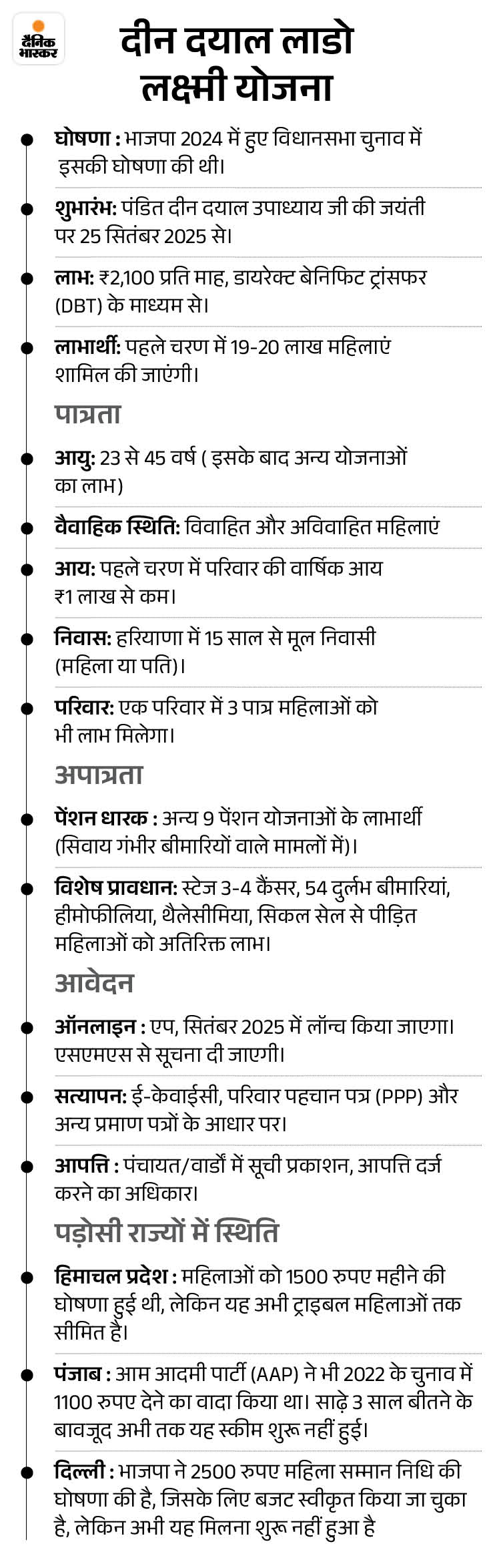 हरियाणा लाडो लक्ष्मी योजना का ट्रायल पूरा:पंचकूला से CM सैनी करेंगे ऐप लॉन्च, रजिस्ट्रेशन के एक महीने बाद मिलेंगे ₹2100