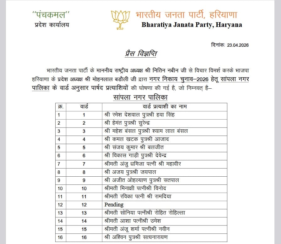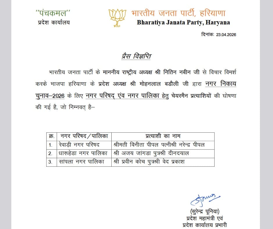 हरियाणा निकाय चुनाव 2026: भाजपा ने जारी की पहली सूची; रेवाड़ी, धारूहेड़ा व सापला के प्रत्याशियों का ऐलान