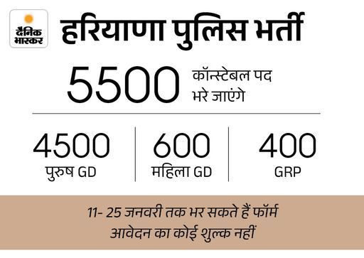 हरियाणा में होने वाली 5500 पुलिस कॉन्स्टेबलों की भर्ती को लेकर युवाओं को बड़ी राहत मिली है। हरियाणा सरकार ने युवाओं को 3 साल उम्र में छूट देने का फैसला किया है। इसकी जानकारी हरियाणा स्टाफ सिलेक्शन कमीशन (HSSC) के चेयरमैन हिम्मत सिंह ने खुद दी है।