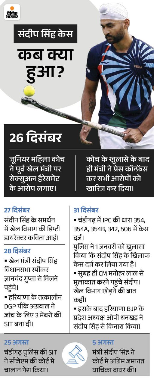26 दिसंबर 2022 को जूनियर महिला कोच ने संदीप सिंह के खिलाफ यौन-उत्पीड़न सहित अन्य आरोप के तहत चंडीगढ़ पुलिस में शिकायत दी थी। जांच के बाद 31 दिसंबर की रात 11 बजे सेक्टर-26 थाने में संदीप सिंह के खिलाफ आईपीसी की धारा 342, 354, 354ए, 354बी, 506 के तहत पुलिस ने केस दर्ज किया था।