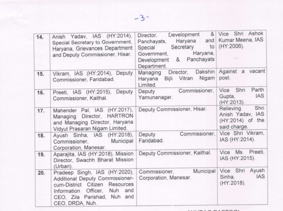 यह पद उन्होंने IPS नवदीप सिंह विर्क की जगह लिया है। IAS महेंद्र पाल (2017) को हिसार का उपायुक्त बनाया गया है। वर्तमान हिसार डीसी IAS अनीश यादव (2014) को विकास एवं पंचायत विभाग का निदेशक बनाया गया है। रवि प्रकाश गुप्ता को हिसार मंडल कमिश्नर नियुक्त किया गया है।